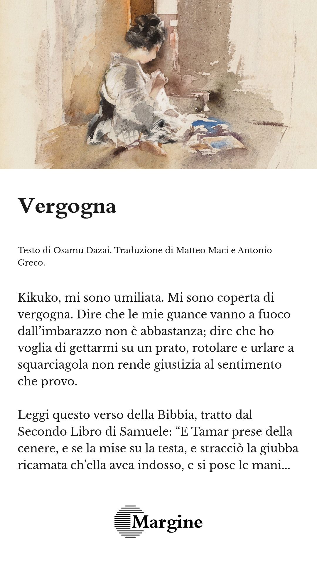 Hai letto il racconto di Toda-san, “I sette fiori della primavera” nel numero di questo mese di Bungakukai? Una ragazza di ventitré anni, che ha paura dell’amore e pensa che la felicità sia detestabile, finisce per sposare un uomo anziano e ricco di sessant’anni, ma subito si scoccia di questa vita e si ammazza. Questa è la storia. Una storia cruda, cupa, con quell’aria tipica dei racconti di Toda. Quando l’ho letta, ho pensato che la protagonista fosse stata scritta prendendo me come riferimento. Avevo appena letto due o tre righe prima di rendermene conto, e mi si è raggelato il sangue. In fondo, la protagonista ha il mio stesso nome e la mia stessa età. E suo padre insegna all’università, proprio come mio padre. A parte questo, la storia della sua vita è totalmente diversa dalla mia, ma per qualche ragione mi ero convinta che le cose che avevo scritto erano state usate come spunto anche per questi dettagli. È da questa mia pura ingenuità che proviene davvero la mia vergogna.