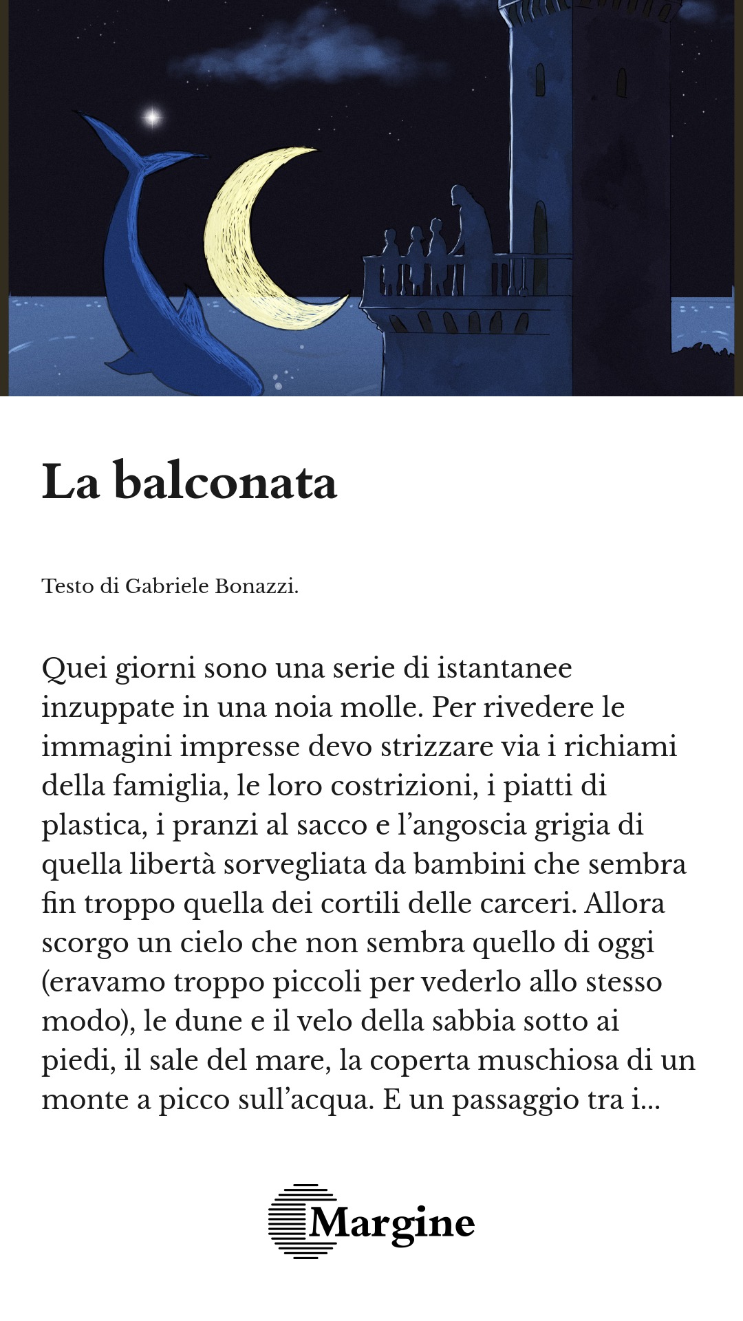 Trovai mio padre sulla spiaggia, con le ginocchia tirate al petto. Aspettavo una punizione; incassai maldestramente un abbraccio. Da allora il nostro rapporto migliorò nettamente. Mi svelò solo un decennio dopo che quella notte mi aveva seguito, e che aveva visto anche lui la balconata.