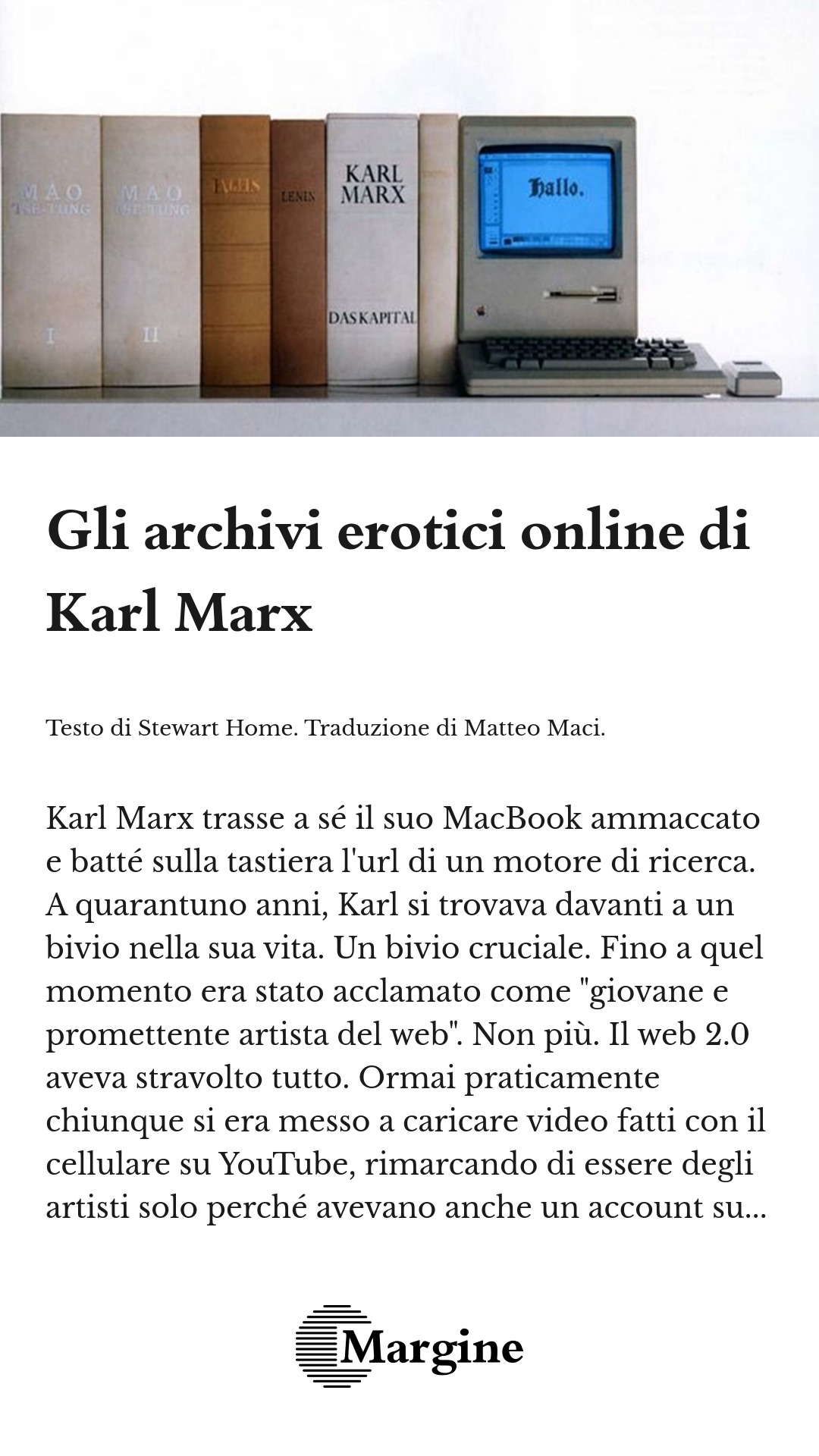 Karl Marx trasse a sé il suo MacBook ammaccato e batté sulla tastiera l’url di un motore di ricerca. A quarantuno anni, Karl si trovava davanti a un bivio nella sua vita. Un bivio cruciale. Fino a quel momento era stato acclamato come “giovane e promettente artista del web”. Non più. Il web 2.0 aveva stravolto tutto. Ormai praticamente chiunque si era messo a caricare video fatti con il cellulare su YouTube, rimarcando di essere degli artisti solo perché avevano anche un account su MySpace. E come se non bastasse, i fondi pubblici destinati alle arti erano stati rovinosamente dirottati al finanziamento delle Olimpiadi del 2012. Il benefattore principale di Karl, un funzionario statale in carriera, gli aveva fatto capire che se il suo pubblico online avesse continuato a calare, allora avrebbe smesso di finanziarlo. C’erano troppe distrazioni su Internet, l’arte non poteva proprio competere con piattaforme come eBay e il sito di Karl non interessava più al pubblico, nonostante gli elogi della critica. Lo stesso Karl dovette ammettere che alcuni siti capitalisti potevano essere divertenti, e che spesso passava ore intere a comporre arredamenti immaginari che avrebbe voluto comprare da Ikea, sfruttando l’accattivante funzione html che la ditta svedese offriva ai suoi potenziali clienti.