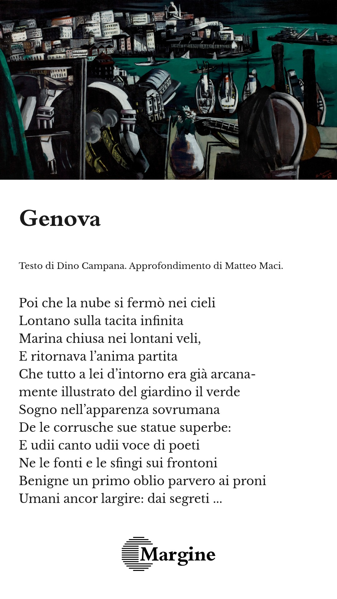 “Genova” simboleggia l’apice della tensione conoscitiva del poeta, che si ritrova pienamente immerso nel Mito. Il componimento si apre con l’immagine della nube che si ferma nei cieli: un segno che il tempo si è immobilizzato nella pienezza di una condizione eterna ed essenziale, non soggetta alla caducità. Uscendo dai vicoli genovesi, il poeta non è che un voyant rispetto alla vastità indefinita del panorama marino. Campana ammise che la poesia faceva parte dei suoi ricordi di viaggio: l’esperienza della memoria, come si vedrà, è una caratteristica fondamentale dell’intera composizione poetica.
