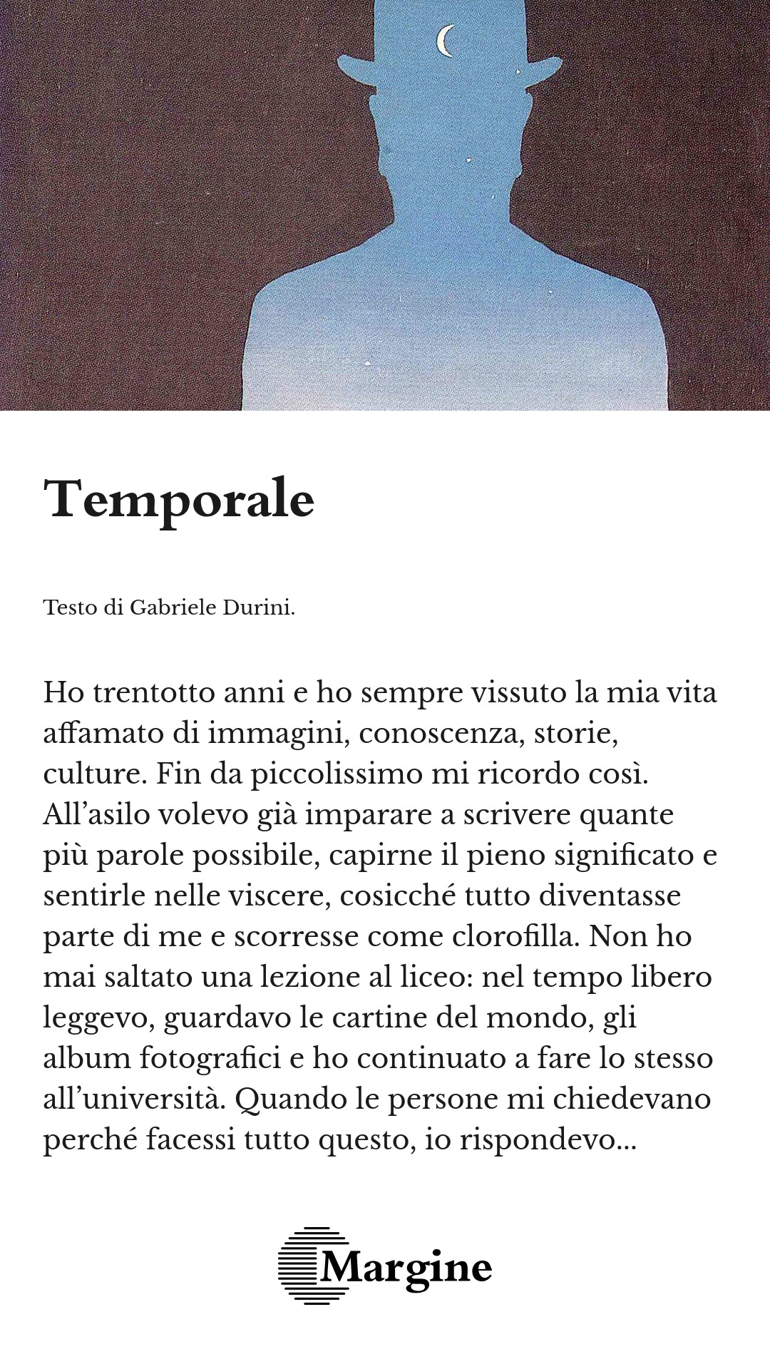 Ho trentotto anni e ho sempre vissuto la mia vita affamato di immagini, conoscenza, storie, culture. Fin da piccolissimo mi ricordo così. All’asilo volevo già imparare a scrivere quante più parole possibile, capirne il pieno significato e sentirle nelle viscere, cosicché tutto diventasse parte di me e scorresse come clorofilla. Non ho mai saltato una lezione al liceo: nel tempo libero leggevo, guardavo le cartine del mondo, gli album fotografici e ho continuato a fare lo stesso all’università. Quando le persone mi chiedevano perché facessi tutto questo, io rispondevo sempre così: «Perché prima o poi succederà qualcosa di terribile.». Sognavo sempre un temporale fuori dalla finestra di casa mia, all’ultimo piano di un palazzo: si avvicinava scuro e minaccioso. Anno dopo anno si faceva sempre più vicino con i suoi tentacoli elettrici rossi e blu. Non parlai mai a nessuno di questo sogno, sapevo già il suo significato, ma esprimerlo a parole sarebbe stato impossibile. Sapevo solo che stava arrivando qualcosa e tutto sommato non mi spaventava più di tanto. Perciò, dire che stava per succedere qualcosa di terribile sembrava una giustificazione – per quanto assurda – agli occhi degli altri, e andava bene così, meglio essere considerato bizzarro piuttosto che un profeta. Perché dico profeta? Perché il mio sogno effettivamente prese forma. Una notte sognai l’arrivo del temporale: il vento riduceva in polvere i vetri, la pioggia faceva marcire il pavimento e i fulmini incendiavano la camera da letto… poi il nulla. Nero. Ero morto? No. In quell’abisso sentivo un profumo di violette, intorno a me in sospensione vi era polvere purpurea. Diventò mattina e aprii gli occhi, ma non vidi nulla. Mossi le mani sul letto ma non udii alcun rumore. E così quel temporale misterioso mi aveva portato via la vista e l’udito. Ero solo. Urlai, piansi, mi dimenai e mentre le mie grida atone mi sconfortavano sempre di più, i colpi inferti al letto con le mie mani mi facevano sentire presente, ancora vero. Non udivo, ma toccavo, non vedevo ma sentivo. Cos’era successo quella notte? Riuscii a prendere il telefono e chiamare mia moglie. Capii dalla vibrazione che lei aveva risposto e allora le dissi di venire subito a casa mia, più in fretta che poteva. O almeno, questo era quello che volevo dirle, ma non avendo ascoltato la mia voce non sapevo se le fosse arrivata… fortunatamente però, lei venne a soccorrermi.