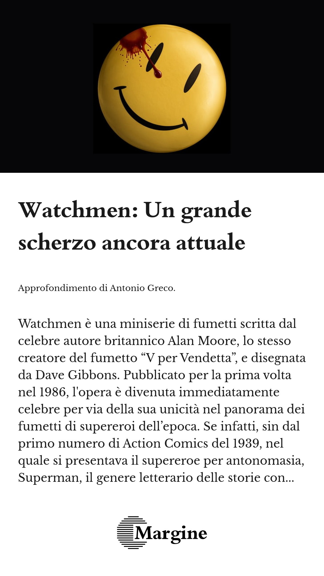 Watchmen è una miniserie di fumetti scritta dal celebre autore britannico Alan Moore, lo stesso creatore del fumetto “V per Vendetta”, e disegnata da Dave Gibbons. Pubblicato per la prima volta nel 1986, l’opera è divenuta immediatamente celebre per via della sua unicità nel panorama dei fumetti di supereroi dell’epoca. Se infatti, sin dal primo numero di Action Comics del 1939, nel quale si presentava il supereroe per antonomasia, Superman, il genere letterario delle storie con protagonisti i supereroi aveva sempre inquadrato queste figure come personaggi positivi, che combattono contro il mare, acciuffando criminali, sconfiggendo mostri e salvando donzelle in pericolo, Alan Moore ha invece impostato la figura del supereroe da un’altra prospettiva: e se i supereroi fossero tanto imperfetti quanto gli esseri umani che li hanno creati?