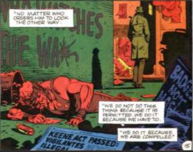 Quando, nel 1966, Il Comico si prese gioco del patetico piano di Capitan Metropoli e Ozymandias di sconfiggere il male con i Crime Busters, Rorschach capì quanto “ammirevole” fosse in realtà Il Comico; questi aveva capito la spietatezza dell’essere umano, la sua crudeltà, e invece che voltarsi dall’altra parte, Blake, aveva accettato tutto questo. Ogni supereroe, secondo Rorschach, fa i conti con questa oscurità prima o poi, e una volta che l’ha vista non può più voltarsi dall’altra parte e far finta di niente: