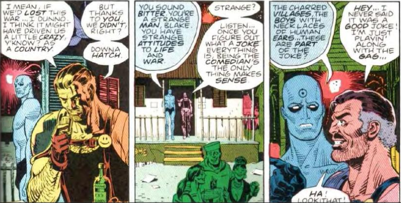 Durante una festa in onore del Comico, la stessa festa in cui verrà scattata la foto con il vicepresidente Ford, Laurie, ubriaca, affronterà Il comico chiedendogli spiegazioni del perché avesse tentato di violentare la madre. La risposta di Blake fu come al solito, secca e causticamente sincera: “è successo solo una volta.”.