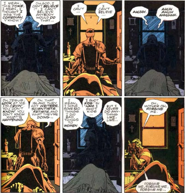 Moloch racconta che Il Comico aveva fatto irruzione in casa sua, in lacrime, sconvolto e ubriaco: farfugliava di un gigantesco scherzo che aveva a che fare con un’isola, sulla quale erano presenti scrittori, scienziati e musicisti: qualcosa di orribile stava per accadere. Il Comico aveva trovato una lista di nomi, sulla quale, fra gli altri, c’era il nome di Moloch e di una certa Janey Slater e tutto questo avrebbe portato a una catastrofica quanto imprevedibile reazione del Dottor Manhattan. Moloch racconta di come Il Comico fosse davvero sconvolto, e che aveva detto apertamente che, nonostante anche lui avesse commesso atrocità in Vietnam e al servizio degli Stati Uniti in altre occasioni, questo grande scherzo era qualcosa senza precedenti.