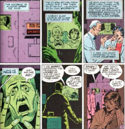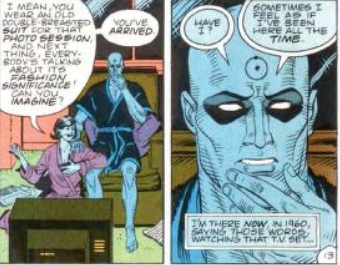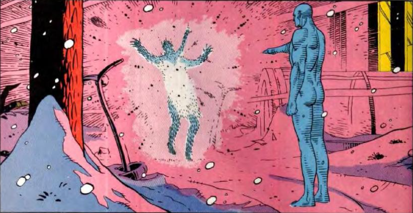 Da quel punto in poi, Jonathan Ostermann non solo potrà alterare la struttura atomica della materia attorno a lui, ma potrà teletrasportarsi, camminare sulla superficie del sole; per via dei suoi poteri, e della segretezza che lo circondò per i primi mesi della sua nuova esistenza, fu ribattezzato “Dr. Manhattan” riferendosi ovviamente all’omonimo progetto che aveva portato alla creazione della bomba atomica. Ma la condizione che più distingue Manhattan da qualunque essere umano è la sua percezione del tempo: dal momento dell’incidente infatti, Jonathan non vive più in un solo tempo presente come il resto dell’umanità, non ricorda il passato in frammenti rielaborati come tutti noi, né specula sul futuro: il tempo per Manhattan è diventato un eterno presente, dove ogni momento, passato, presente o futuro, è percepito da Manhattan come attuale e simultaneo.