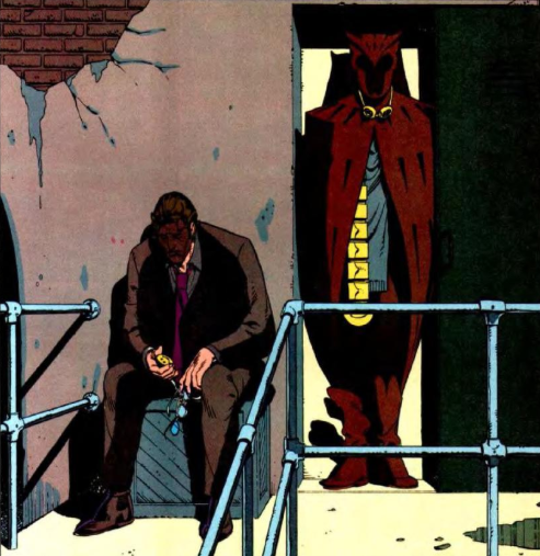 Quella sera, l’uomo dalle orecchie a punta riceve una visita inaspettata: Rorschach infatti è riuscito a entrare in casa sua, forzando la serratura; Rorschach interroga l’uomo, Edgar Jakobi, supercattivo un tempo noto come “Moloch il mistico”, nuovamente libero dopo aver trascorso gli anni Settanta in carcere; Moloch dapprima dissimula, affermando di essere solo un imprenditore in pensione, poi conferma la sua vera identità, rivelando che quel giorno era andato al funerale del comico, uno dei suoi acerrimi nemici, poiché sentiva di doverlo fare, dopo che la settimana prima della morte di Blake, quest’ultimo era venuto a trovarlo a sorpresa.