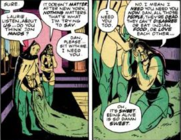 Quando Lauriel torna sulla terra e scopre il piano di Veidt insieme agli altri, ed è costretta ad accettarne l’esito, si apparta con Daniel avvertendo il bisogno di amore, sentendo il profumo dell’aria, il dolce sapore della vita: