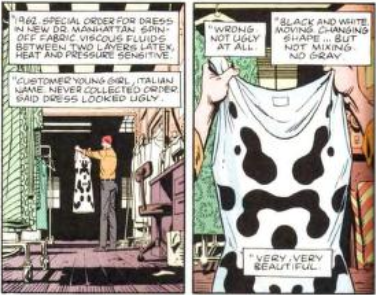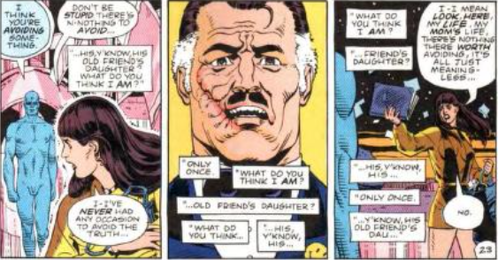 Laurie comprende così che proprio quell’uomo che tanto ha odiato, quello che aveva tentato di violentare sua madre, era proprio suo padre. In questo ennesimo crudele scherzo però, Manhattan ci vede un miracolo, un miracolo “termodinamico”: un evento talmente raro da essere praticamente impossibile, come la conversione spontanea dell’ossigeno in oro, o come la nascita di Lauriel dovuta all’incontro casuale e imprevedibile di sua madre con Il Comico, e se si moltipilicano tutti gli incontri fatti nel corso di queste due vite per il numero degli antenati di Lauriel si arriva proprio a lei, una forma di vita rarissima, unica fra miliardi di possibilità.