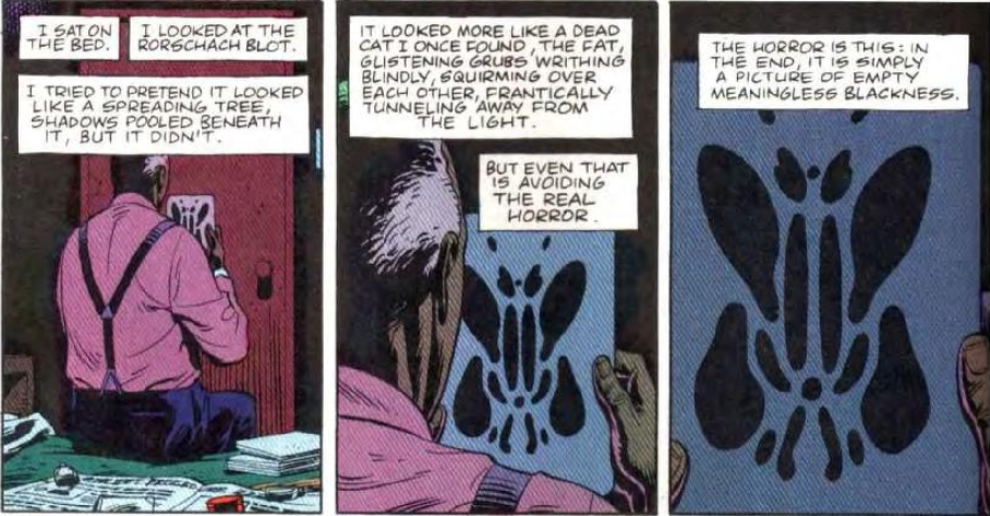 La visione del mondo di Rorschach, per quanto oscura e cinica come quella del Comico, è molto più orientata all’azione che non alla passività. Il nichilismo esistenziale di Edward Blake è un esercizio sterile e fine a sé stesso, mentre quello di Rorschach è rigido è inflessibile, bianco o nero. Verità a tutti i costi, niente compromessi, anche di fronte alla catastrofe.