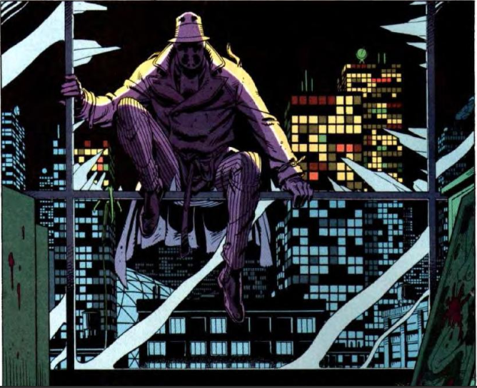- Walter Jospeh Kowalsk, “Rorschach”: un detective impassibile e disilluso, un personaggio disincantato in perfetto stile noir. Rorschach rappresenta appieno lo stereotipo del vigilante, che si fa giustizia a modo suo, tuttavia, nel modo in cui viene presentato il personaggio, non si può non notare quale rischio la società corra nel lasciare agire un elemento come Rorschach, che spesso uccide i criminali anziché catturarli. Rorschach non fa compromessi “neppure davanti all’olocausto” e non ha una vita all’infuori della sua maschera, che ama chiamare “pelle” . Gibbons ha confermato che Rorschach è stato ispirato al topos del detective noir, in particolare sarebbe ispirato a Sam Spade nel romanzo giallo “Il falcone di Malta” di Dashiell Hammet.