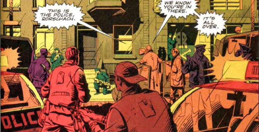 Nonostante il movente non sia ancora chiaro, un collega di Fine specula che si potesse trattare di una banda criminale nota come “I nodi”, ma Fine non prende sul serio questa pista, e consiglia di mantenere un basso profilo per non attirare l’attenzione dei “vigilanti mascherati”: infatti, nonostante la messa al bando di tutti i vigilanti non governativi, nella città di New York è rimasto attivo un solo vigilante governativo, noto come Rorschach. Temuto, spietato e violento, Rorschach ha spesso interferito con le operazioni della polizia, catturando e giustiziando criminali e sospettati; per il detective Fine l’intervento di Rorschach significherebbe ritrovarsi con una montagna di omicidi da gestire.