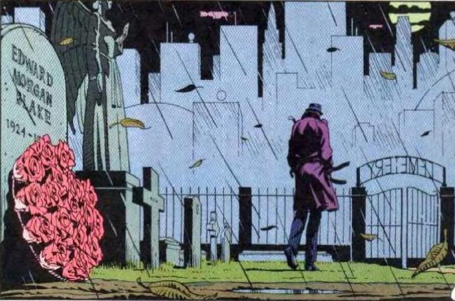 Conclusa la cerimonia funebre a New York, dopo che Ozymandias, Manhattan e Gufo Notturno 2 si sono scambiati a vicenda le condoglianze, un uomo misterioso dalle orecchie a punta, dopo aver posato un mazzo di rose sulla lapide di Blake, cerca di sgusciare via indisturbato; un uomo dai capelli rossi e con in mano un cartello con scritto “La fine è vicina” nota la scena.