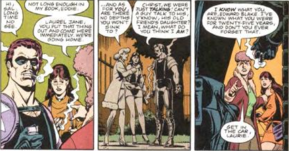 Il Comico tentò di recuperare, dicendo che pensava che avessero chiarito tutto in passato, ma Sally mise bene in chiaro che certe cose non si chiariscono mai del tutto e che non avrebbe permesso che a Lauriel capitasse la stessa cosa capitata a lei. All’epoca Lauriel non sapeva quello che Edward Blake aveva tentato di fare a sua madre, ma quando lo scoprì, con la pubblicazione del libro di Mason, andò su tutte le furie.