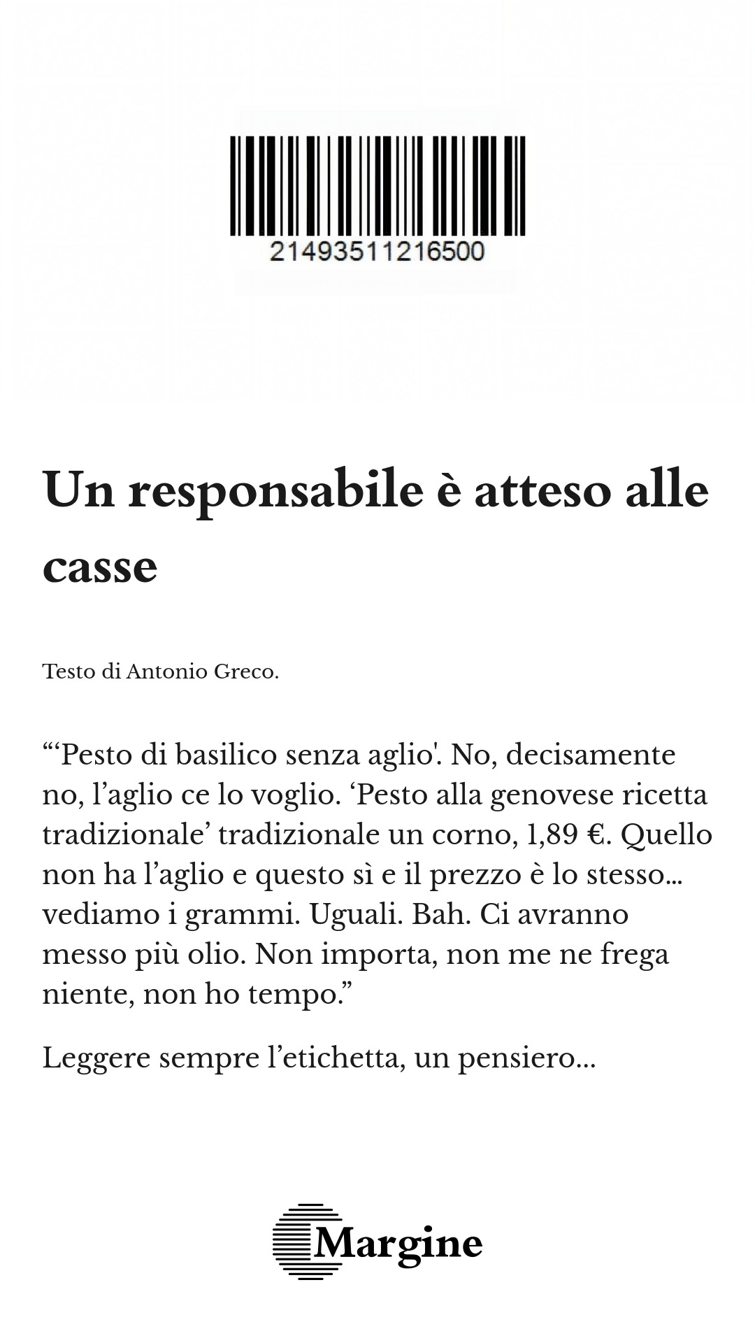 “‘Pesto di basilico senza aglio’. No, decisamente no, l’aglio ce lo voglio. ‘Pesto alla genovese ricetta tradizionale’ tradizionale un corno, 1,89 €. Quello non ha l’aglio e questo sì e il prezzo è lo stesso… vediamo i grammi. Uguali. Bah. Ci avranno messo più olio. Non importa, non me ne frega niente, non ho tempo.”