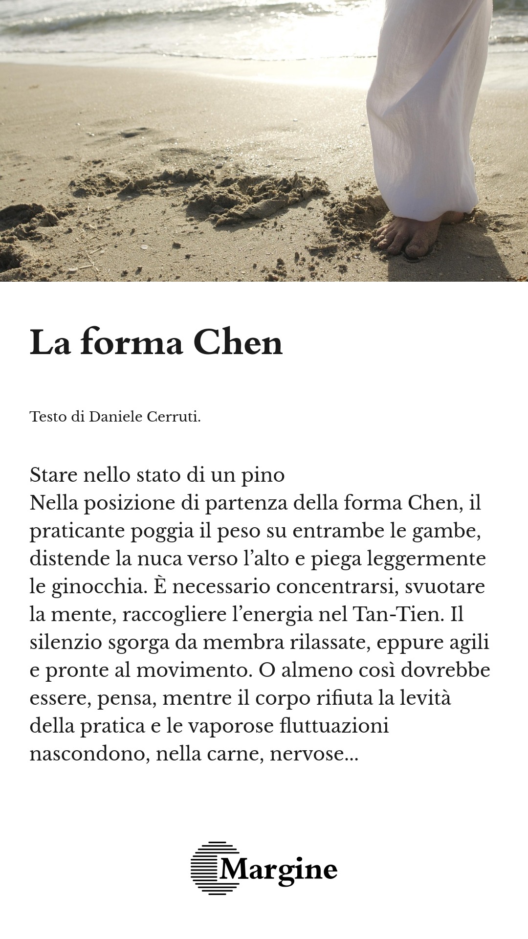 Nella posizione di partenza della forma Chen, il praticante poggia il peso su entrambe le gambe, distende la nuca verso l’alto e piega leggermente le ginocchia. È necessario concentrarsi, svuotare la mente, raccogliere l’energia nel Tan-Tien. Il silenzio sgorga da membra rilassate, eppure agili e pronte al movimento. O almeno così dovrebbe essere, pensa, mentre il corpo rifiuta la levità della pratica e le vaporose fluttuazioni nascondono, nella carne, nervose desolazioni.