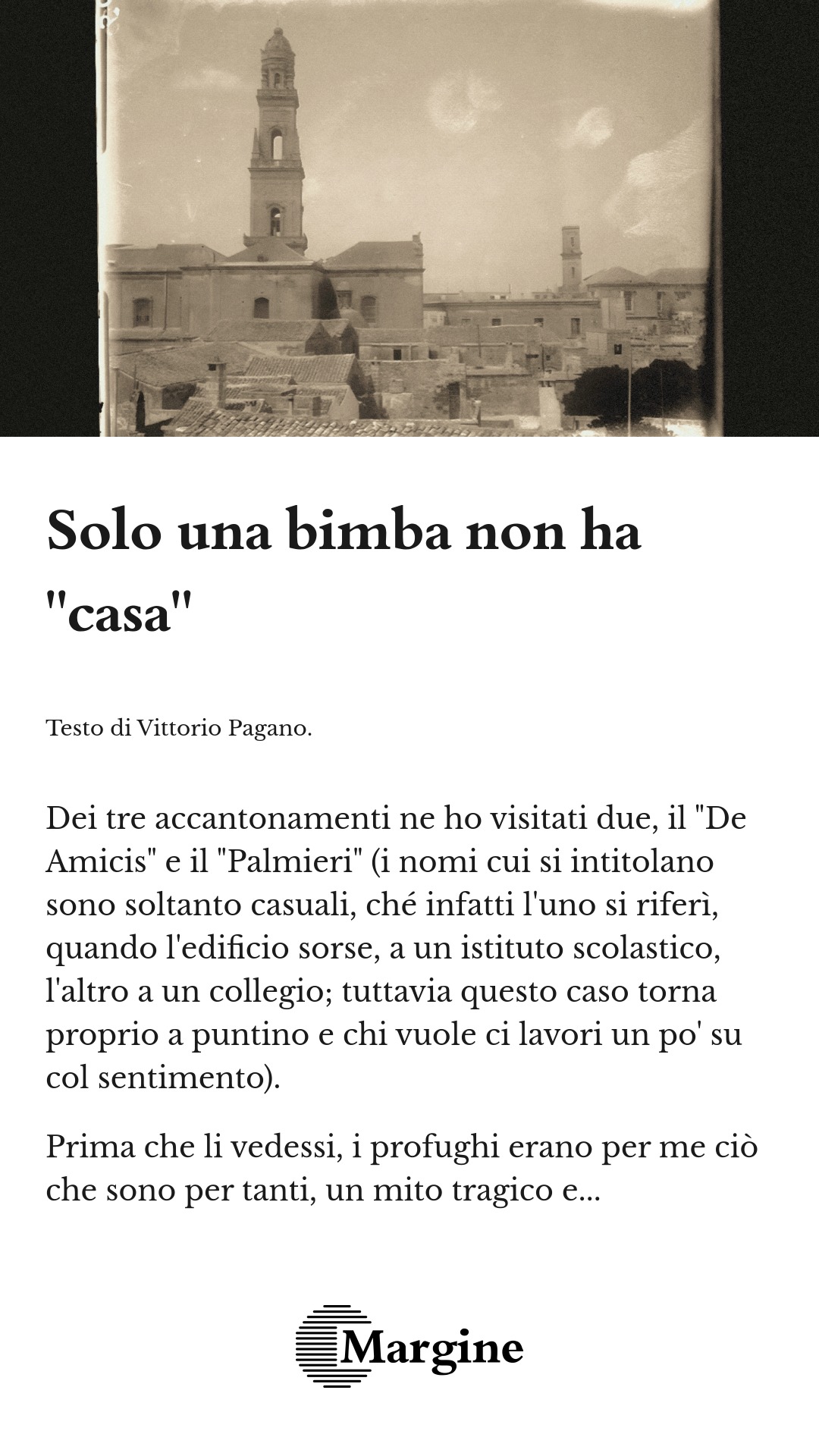 Vi proponiamo in lettura il primo dei Reportages in città firmati da Vittorio Pagano per la rivista Libera Voce, organo di stampa del Partito d’Azione di Lecce. Ciò che più colpisce, in questi testi, è l’attenzione per le fasce sociali meno agiate, la riflessione su istituzioni ed esperienze di vita solitamente associate a contesti di disagio, come il campo profughi di questo reportage, ma anche l’ospedale psichiatrico o il cimitero, affrontati dall’autore nei numeri successivi. Pagano analizza queste realtà, inserite in uno scenario cittadino che si sta risollevando dalla catastrofe della Seconda Guerra Mondiale, non con gli strumenti scientifici della sociologia, ma con il suo tratto inconfondibile di letterato e poeta, che gli permette di spaziare tra la descrizione oggettiva dei fatti e le suggestioni artistiche, l’attenzione per i dettagli più umani e le profonde considerazioni personali. Il testo è tratto dal volume Reportages in città e altre prose, a cura di Paola Greco, Conte Editore, 1995.
