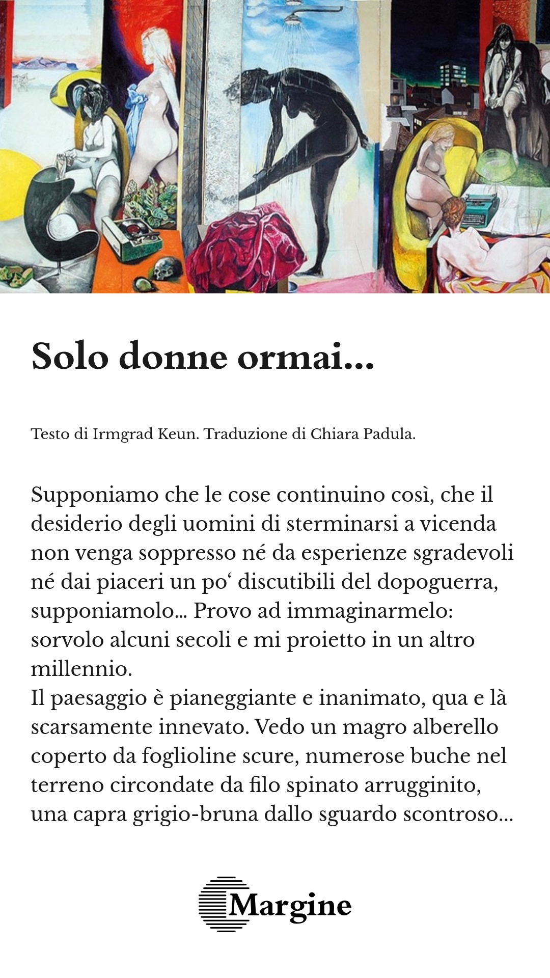 Lasciamo forse gli uomini andare in giro liberamente? Non si è mai perso nessuno? Racconto che da noi si possono vedere orde di adorabili uomini liberi e non protetti in tutti gli uffici e in ogni tram; uomini che passeggiano per le strade senza scorta e racconto che non sono mai venuta a conoscenza di casi di aggressione da parte di donne. I nostri giornali non hanno nemmeno mai riportato notizie di uomini rapiti da donne. Le donne sono esterrefatte. Pensano che volessi vantarmi spudoratamente con i nostri alti standard morali. Non può esistere così tanta onestà. Loro confessano di aver sentito che molto molto lontano, in un’altra comunità di donne, esiste un altro uomo, e di aver inviato una spedizione con l’intenzione di rapirlo. Tuttavia, le partecipanti alla spedizione non sono ancora tornate, per cui non si sa se la voce sia fondata o no.