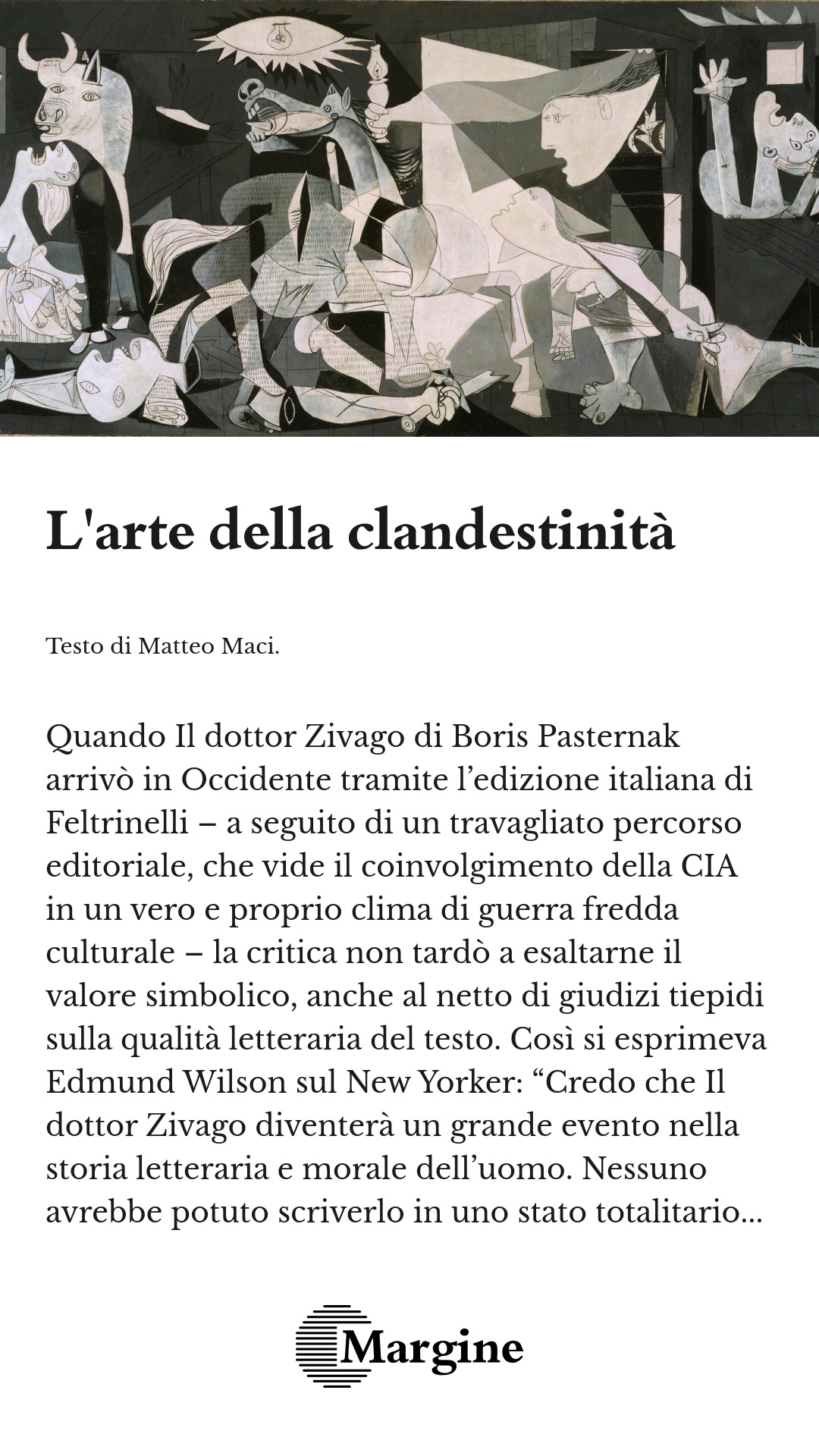 Comunque, come accennato in precedenza, nessuno di questi due approcci ha un valore di verità superiore all’altro, per quanto la lettura ideologica finisca spesso per assumere una valenza emotiva che la fa apparire più “affidabile”, più “rassicurante”, più “umana”. Ma non per questo si può considerare diversamente parziale della lettura formalista dell’arte, né la dicotomia tra le due filosofie va ritenuta irriducibile. Il grande pregio dell’ideologia, in questo come in altri contesti, è la sua capacità di costruire narrazioni, di restituire visioni del mondo ordinate e coerenti con i propri valori di riferimento. Ed è per questo che opere come Il Dottor Zivago di Pasternak o Guernica di Picasso ci sembrano, riprendendo Wilson, “grandi eventi nella storia morale dell’uomo”: il concetto di arte come contraltare ai totalitarismi, alla repressività, ci suggerisce una certa urgenza morale dell’opera artistica che deve scavalcare i confini imposti dallo stato per diffondersi e trovare uno spazio “consono” nel mondo. L’Occidente, avendo fondato le proprie ragioni ideologiche sull’idea di Libertà, al netto della vaghezza e delle sfumature che ha assunto tale concetto nei contesti più disparati, ha sempre promosso e ideologizzato le espressioni artistiche “clandestine”, fino al punto di romanticizzare fenomeni come i samizdat, le copie di testi censurati che circolavano nei Paesi socialisti, specie in Russia e nell’Europa orientale. Ma un’opera d’arte può essere davvero “clandestina”? Soprattutto, la “clandestinità” riguarda il contenuto, la forma o le modalità di trasmissione dell’arte?